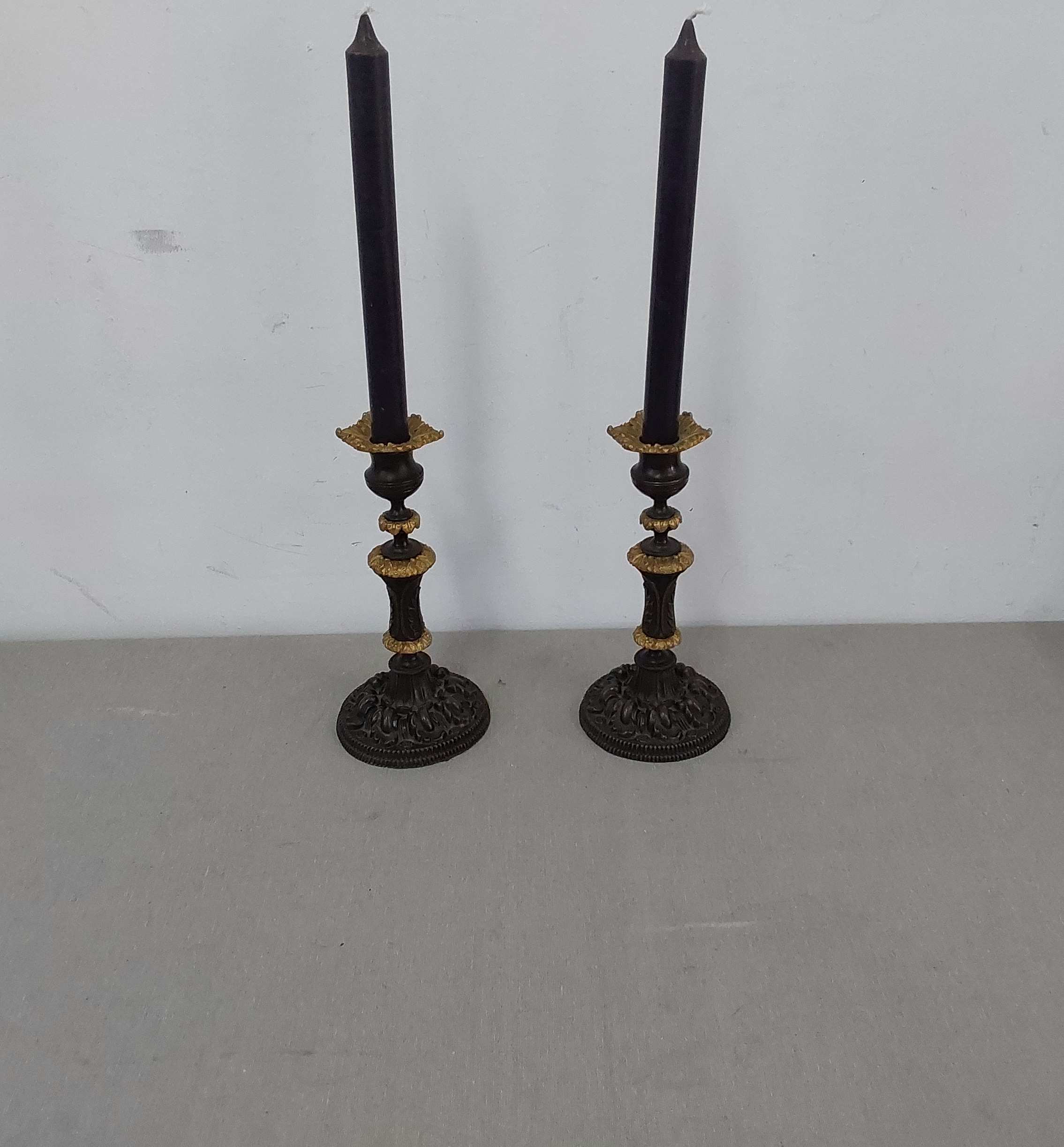 498/13 Pair of metal ornated candle holders with candl ...